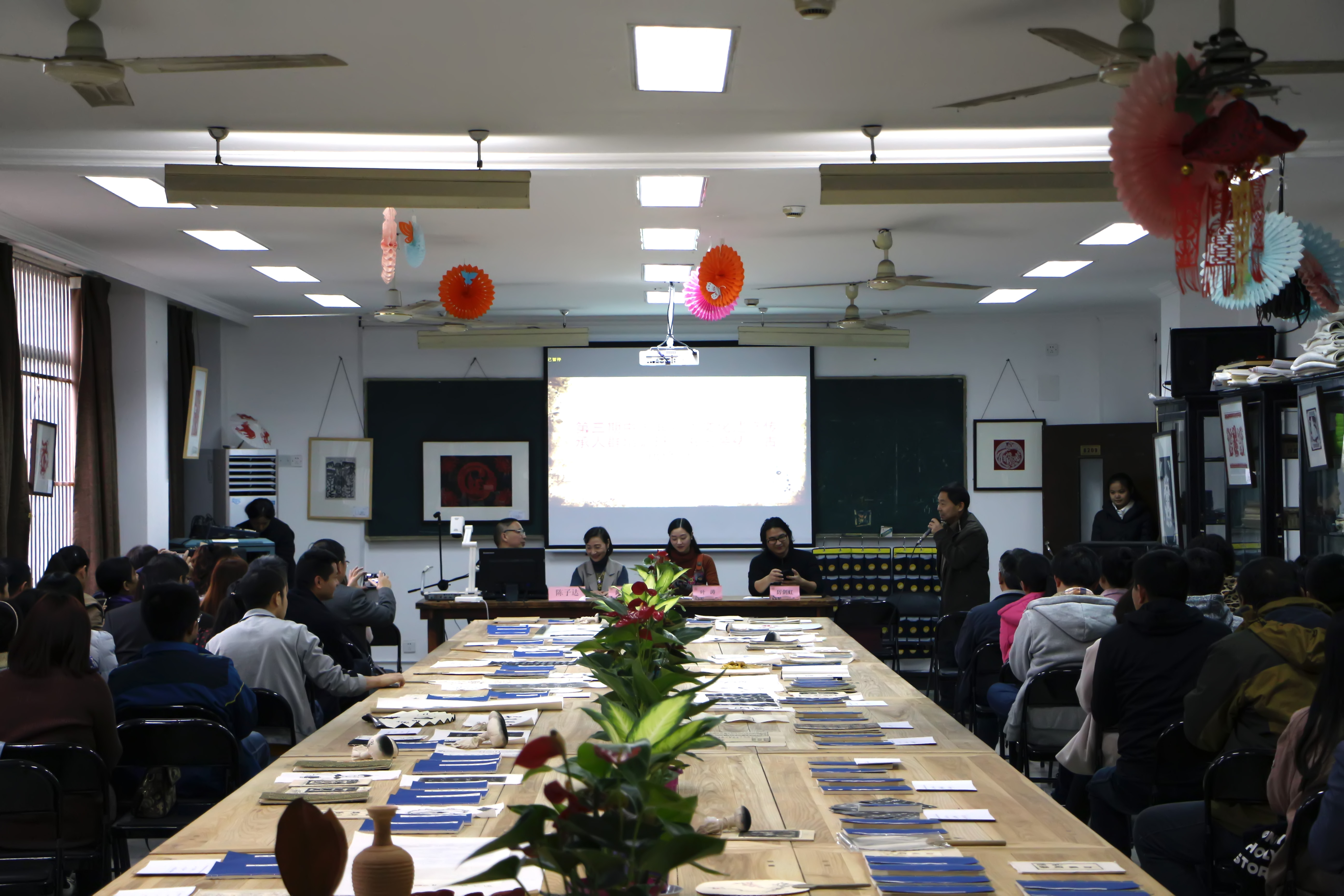 叶涛代表省文化厅非遗处发言。一声“同仁”,拉近了她与这群同样为非遗保护而努力的学员的距离。叶涛说,本期培训班汇集了各个省份的精英,班里卧虎藏龙、高手如林,所以在这次学习成果作品展中不仅看到了字画装裱和古籍修复,也看到了传拓、书画甚至剪纸、陶艺等。叶涛认为,在非遗的几大门类中,书画装裱和古籍修复是一个非常特殊的项目,它在传承中所体现的包容性,对别的门类的集聚性,都是别的项目所不拥有的。传拓、剪纸、陶艺等,都构成了书画装裱、古籍修复项目不可或缺的专业背景。可以说,如果其它的传统手工是为大众生活服务的,那么,书画装裱和古籍修复,其实是用一种手工技艺,来向我们的传统生活、精神生活进行追问。这不是草根文化,而是雅文化,是雅文化当中的精华。非遗传承不易,如何遵循文化部在十三五期间对非遗保护提出的“巩固抢救成果,提升传承水平”要求?叶涛说,这也是非遗传承人群培研计划的初衷:借助院校的力量,来提升传承能力和水平。如何找准定位,如何把握现代审美,如何与市场进行精确对接,这需要在对自身技艺进行要求的同时,思考与现代生活进行联接。她展望多年以后,学员们有的自成一派,有的发展成了我们的民族品牌,有的积累了巨大的社会财富,但他们仍会记得,在2016年,在杭州这个美丽的城市,在浙艺和老师同学的朝夕相处。