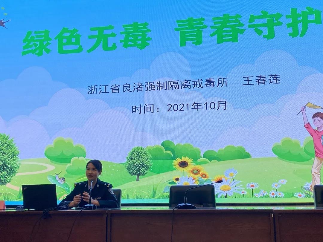 浙江省良渚强制隔离戒毒所王春莲警官以“绿色无毒 青春守护”为题,从珍爱生命、远离毒品,毒品的四道刑罚,戒毒所统一模式三个方面展开讲座。她介绍了吗啡、大麻、冰毒等传统毒品,尤其对新型毒品的类别和成瘾性进行详细讲解,“上头电子烟”、“聪明”药、LSD溶剂、笑气等悄然兴起,这些毒品更加隐秘,不经意间就会“中招”。