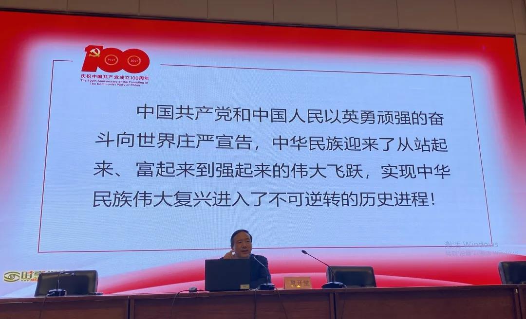 夏开堂以“奋斗百年路,启航新征程”为题,以时间为轴,从丰功伟绩、恢弘史诗;精神血脉、代代相传;以史为鉴、开创未来三方面展开,用简洁的图文、详实的数据,回顾一百年来中国共产党团结带领人民创造新民主主义革命的伟大成就、社会主义革命和建设的伟大成就、改革开放和社会主义现代化建设的伟大成就、新时代中国特色社会主义的伟大成就,中华民族从站起来、富起来到强起来的伟大飞跃。同时,深入阐释坚持真理、坚守理想,践行初心、担当使命,不怕牺牲、英勇斗争,对党忠诚、不负人民的伟大建党精神的深刻内涵和时代价值,以及在新征程上要牢牢坚持“九个必须”。他指出,“九个必须”揭示了过去我们为什么能够成功、未来我们怎样才能继续成功的深刻道理,这既是对建党百年来积累的宝贵经验的高度概括,又是对在新征程上勇往直前所作出的战略部署,进一步深化了对共产党执政规律、社会主义建设规律、人类社会发展规律的认识,必将激励我们在新征程上更加坚定、更加自觉地牢记初心使命、开创美好未来。希望党员和同学们树立正确的政治方向,筑牢理想信念,志存高远、脚踏实地,勇担时代重任,不负青春韶华。