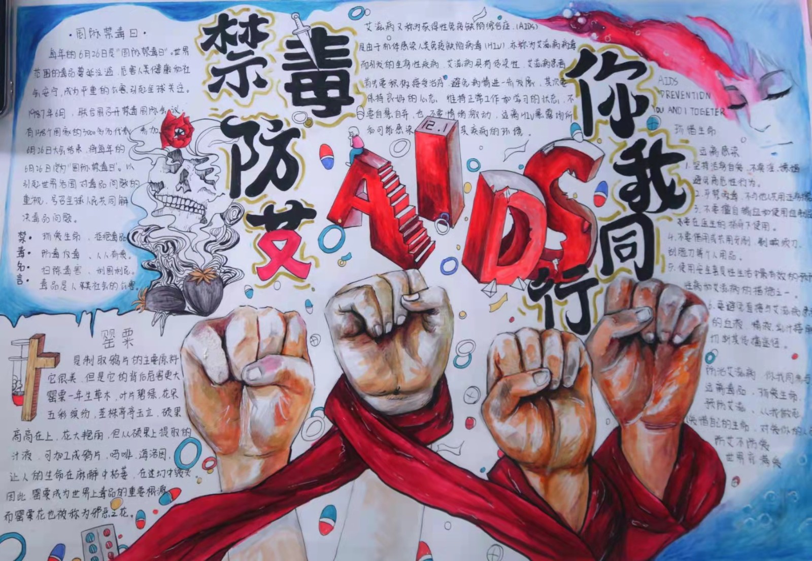 “防艾禁毒青春健康知识”手抄报比赛。为了更好的宣传预防艾滋病,也为了更好的让防艾关“艾”进校园,11月25——12月6日,校团委面向全校同学征集防艾禁毒手抄报,通过绘制海报的形式来让更多的同学了解艾滋病,正视艾滋病。在此次防艾公益海报设计比赛中,同学们充分展开了想象和设计的翅膀,踊跃投稿,设计出一系列契合主题、直观生动的宣传海报。