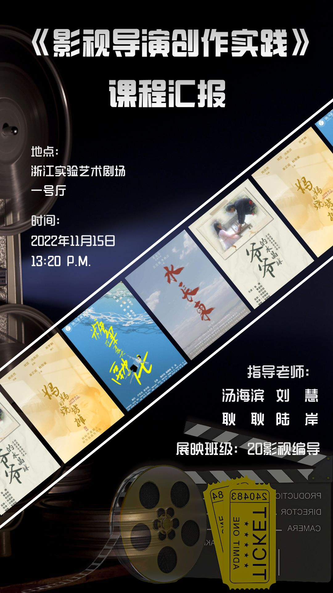 《影视导演创作实践》是戏剧影视学院影视编导专业的必修课程,以理论与实践相结合的原则,使学生全面、系统地掌握影视导演创作的基本知识和能力。11月15日下午13:20,戏剧影视学院20级影视编导班微电影展映礼暨《影视导演创作实践》课程汇报将在浙江实验艺术剧场1号厅举办。本次共有4部微电影参与展映,旨在为20级影视编导专业的学生提供作品展示与交流的平台,进一步培养学生掌握剧本分析和创作、画面摄制、剪辑等基本能力。