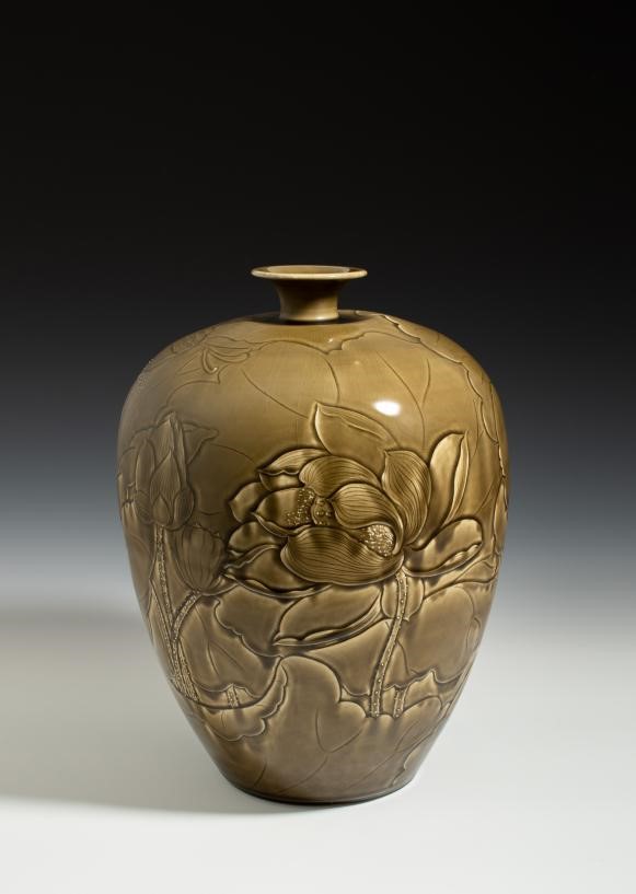 《灰釉刻花牡丹瓶》